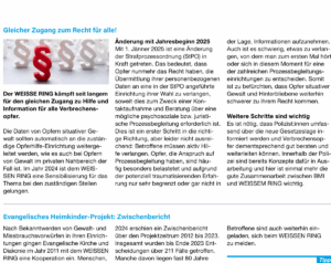 In unserer aktuellen Zeitung finden Sie zum Nachlesen zahlreiche Aktivitäten des WEISSEN RINGS im ersten Halbjahr 2025....